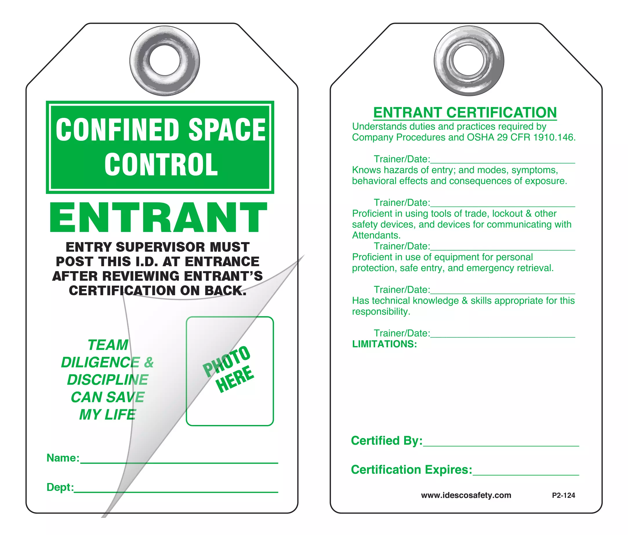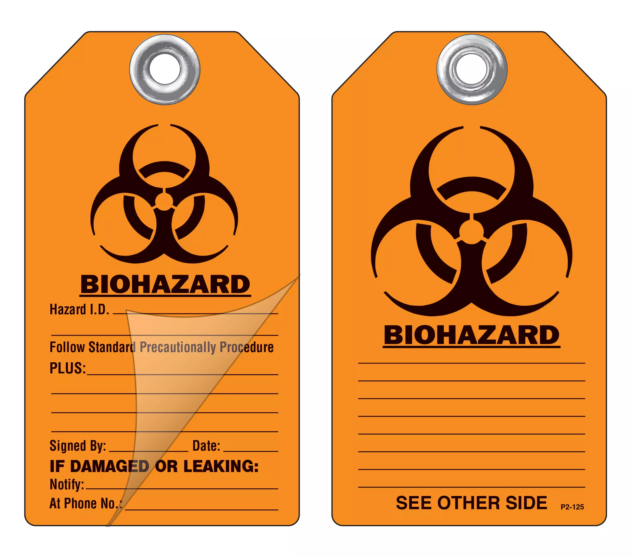 These self-laminating P/S lockout, safety and operational tags allow you to write specific instructions in pen, pencil or marker. Then simply press down a pressure-sensitive laminating film which protects the tag from moisture, dirt, grease and chemicals. No equipment is needed to laminate these tags. Each tag has a pull strength that exceeds the OSHA-required 50 lbs. Printing is on rigid plastic and a 2 mil polyester lamination on either one or two sides.