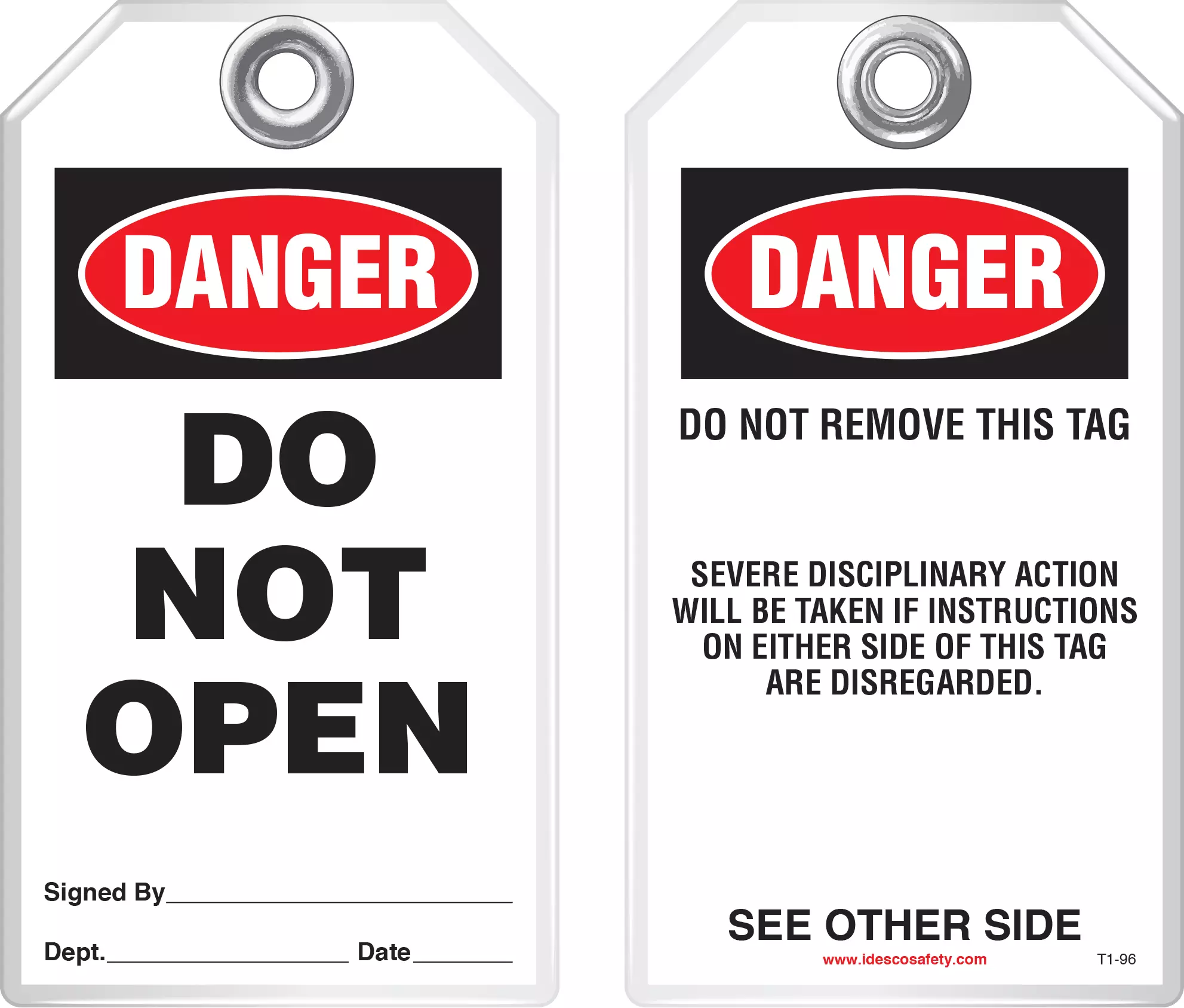 Idesco Safety's Classic Industrial safety tags are uniquely durable and strong and they are the most popular lockout safety tag for thousands of industrial companies around the world! They hold up against moisture, dirt, grease, chemicals and extreme temperatures. Each tag has a 3/8 hole reinforced with a metal grommet and has a pull strength that exceeds the 50 lb pull strength established by OSHA's Lockout/Tagout standard (OSHA 1910.147). Printing is UV protected and encapsulated inside rigid PVC. This rugged material has a durable, hard-matte finish which retains pen, pencil and marker notations and pencil may be erased for multiple use.