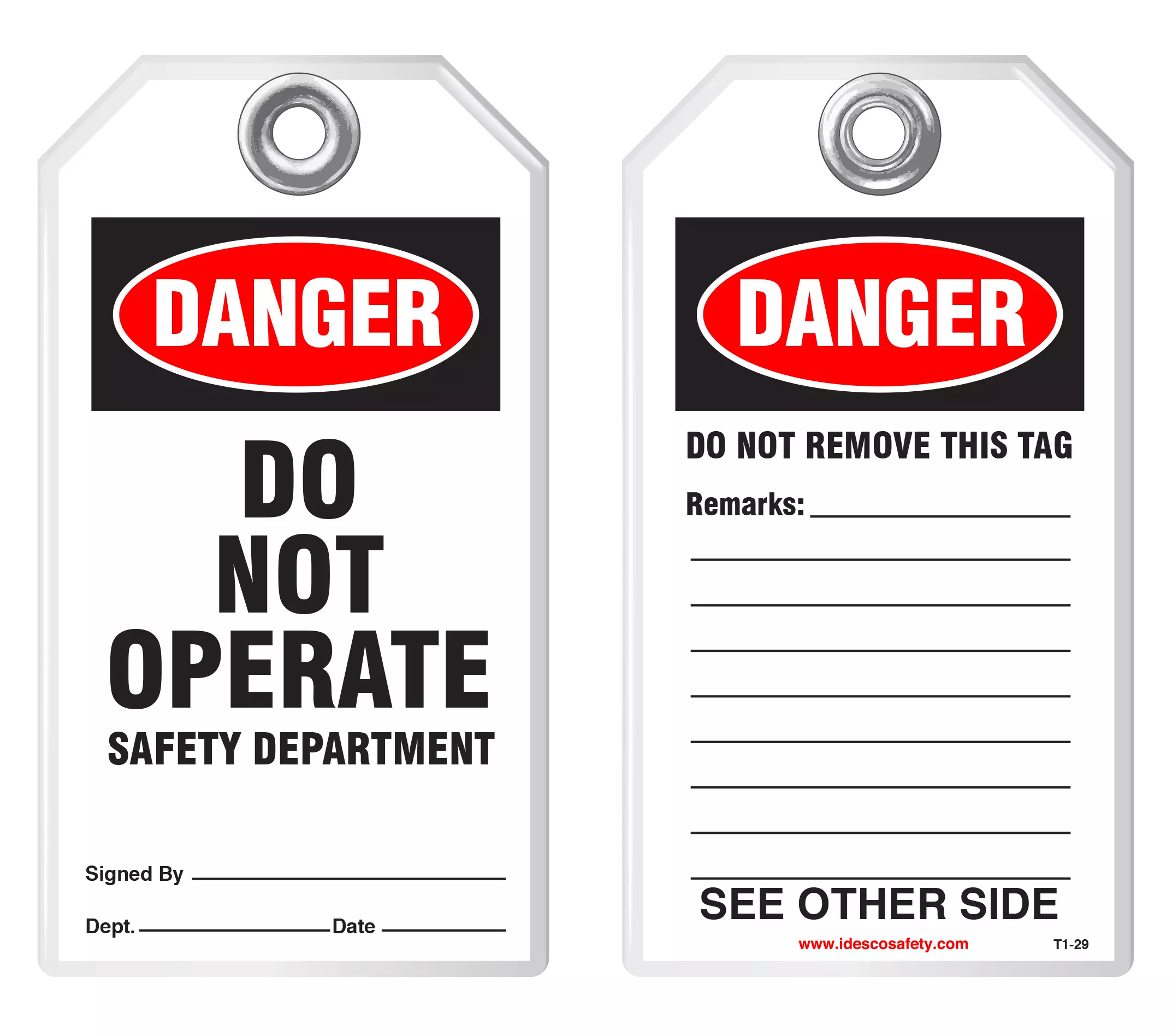 Idesco Safety's Classic Industrial safety tags are uniquely durable and strong and they are the most popular lockout safety tag for thousands of industrial companies around the world! They hold up against moisture, dirt, grease, chemicals and extreme temperatures. Each tag has a 3/8 hole reinforced with a metal grommet and has a pull strength that exceeds the 50 lb pull strength established by OSHA's Lockout/Tagout standard (OSHA 1910.147). Printing is UV protected and encapsulated inside rigid PVC. This rugged material has a durable, hard-matte finish which retains pen, pencil and marker notations and pencil may be erased for multiple use.