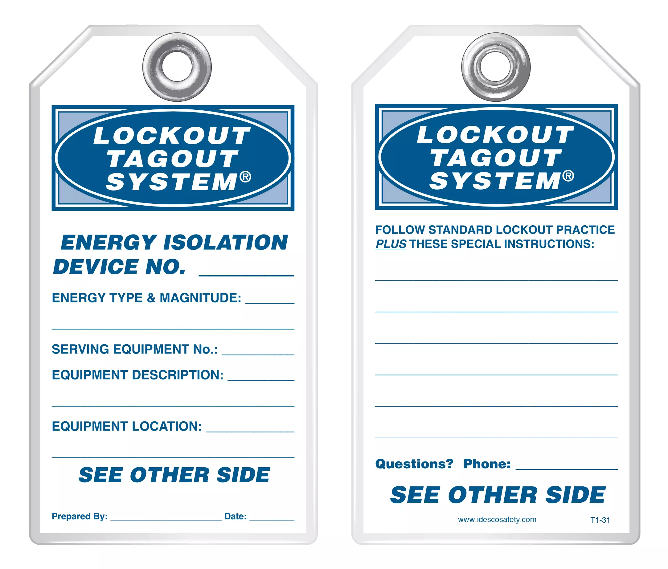Idesco Safety's Classic Industrial safety tags are uniquely durable and strong and they are the most popular lockout safety tag for thousands of industrial companies around the world! They hold up against moisture, dirt, grease, chemicals and extreme temperatures. Each tag has a 3/8 hole reinforced with a metal grommet and has a pull strength that exceeds the 50 lb pull strength established by OSHA's Lockout/Tagout standard (OSHA 1910.147). Printing is UV protected and encapsulated inside rigid PVC. This rugged material has a durable, hard-matte finish which retains pen, pencil and marker notations and pencil may be erased for multiple use.