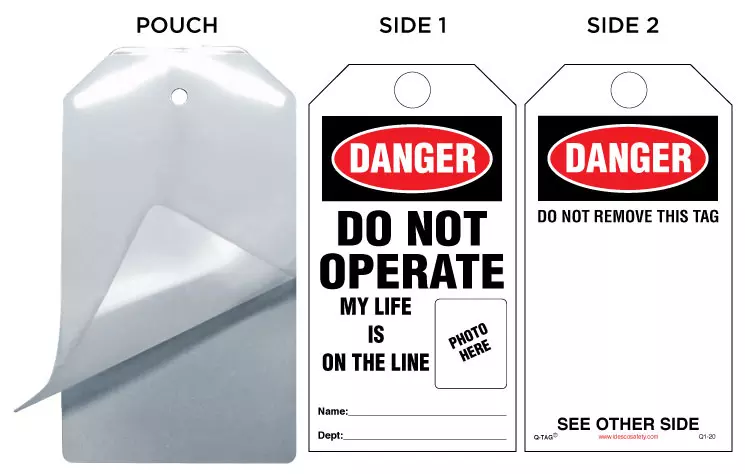 Use our Q-Tag® Laminating Pouches when you want to imprint or attach an operator's photo to a safety tag, or when you wish to customize a tag and then seal it in durable plastic for long term notice or lockout situations.