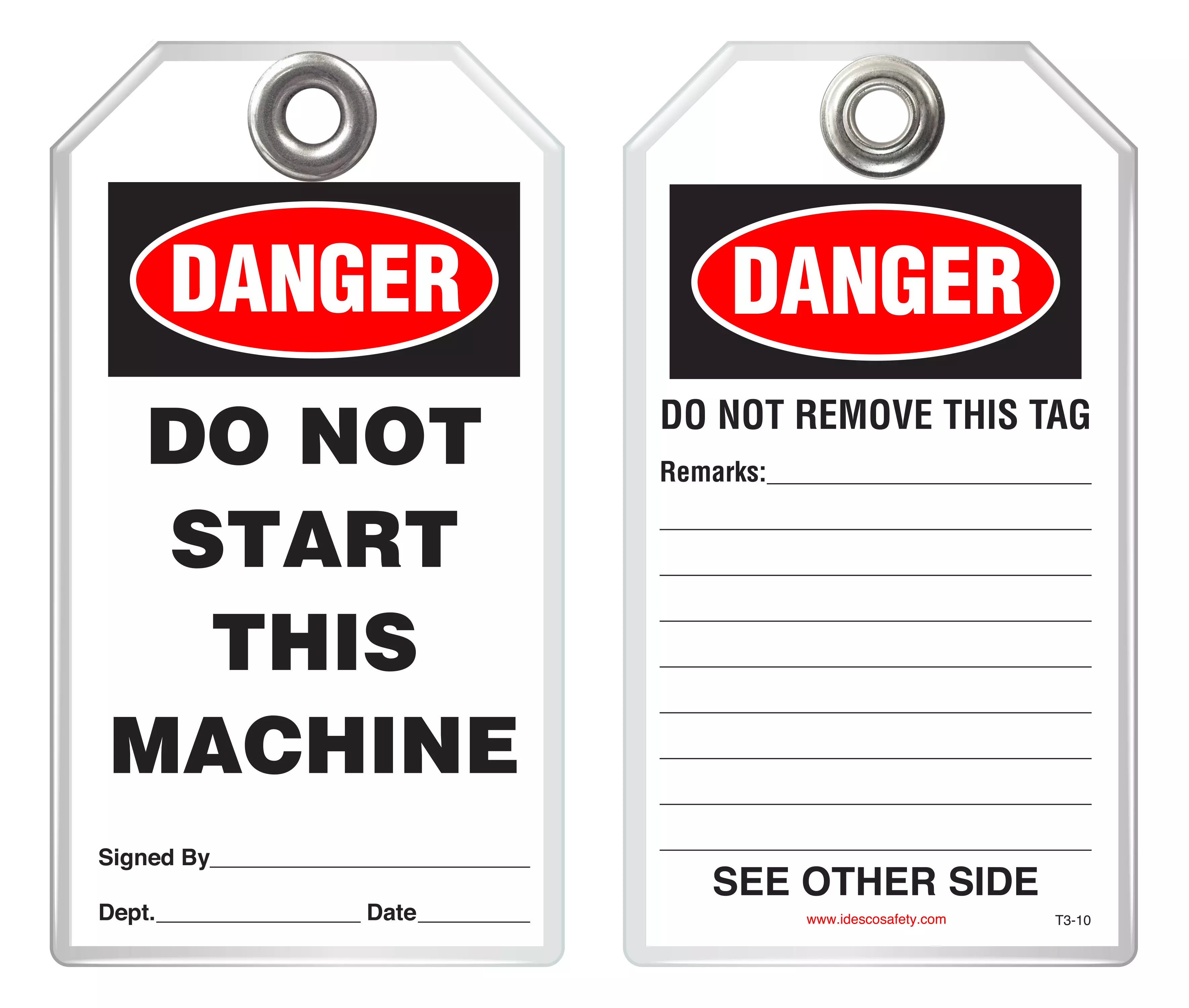 Idesco Safety's Classic Industrial safety tags are uniquely durable and strong and they are the most popular lockout safety tag for thousands of industrial companies around the world! They hold up against moisture, dirt, grease, chemicals and extreme temperatures. Each tag has a 3/8 hole reinforced with a metal grommet and has a pull strength that exceeds the 50 lb pull strength established by OSHA's Lockout/Tagout standard (OSHA 1910.147). Printing is UV protected and encapsulated inside rigid PVC. This rugged material has a durable, hard-matte finish which retains pen, pencil and marker notations and pencil may be erased for multiple use.