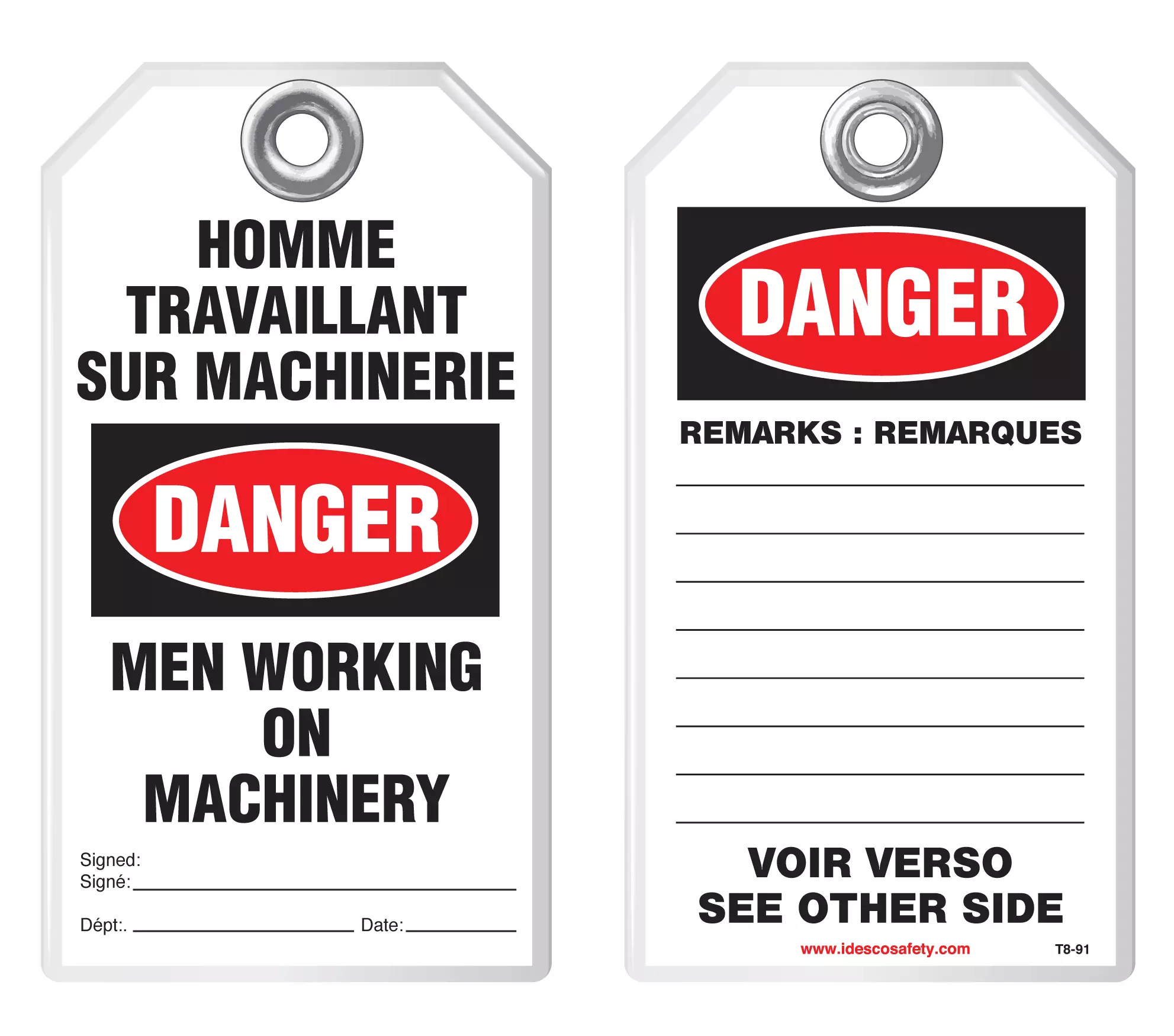 Bilingual Safety Tag - Danger, Homme Travaillant Sur Machinerie, Men Working On Machinery (English/French) T8-91