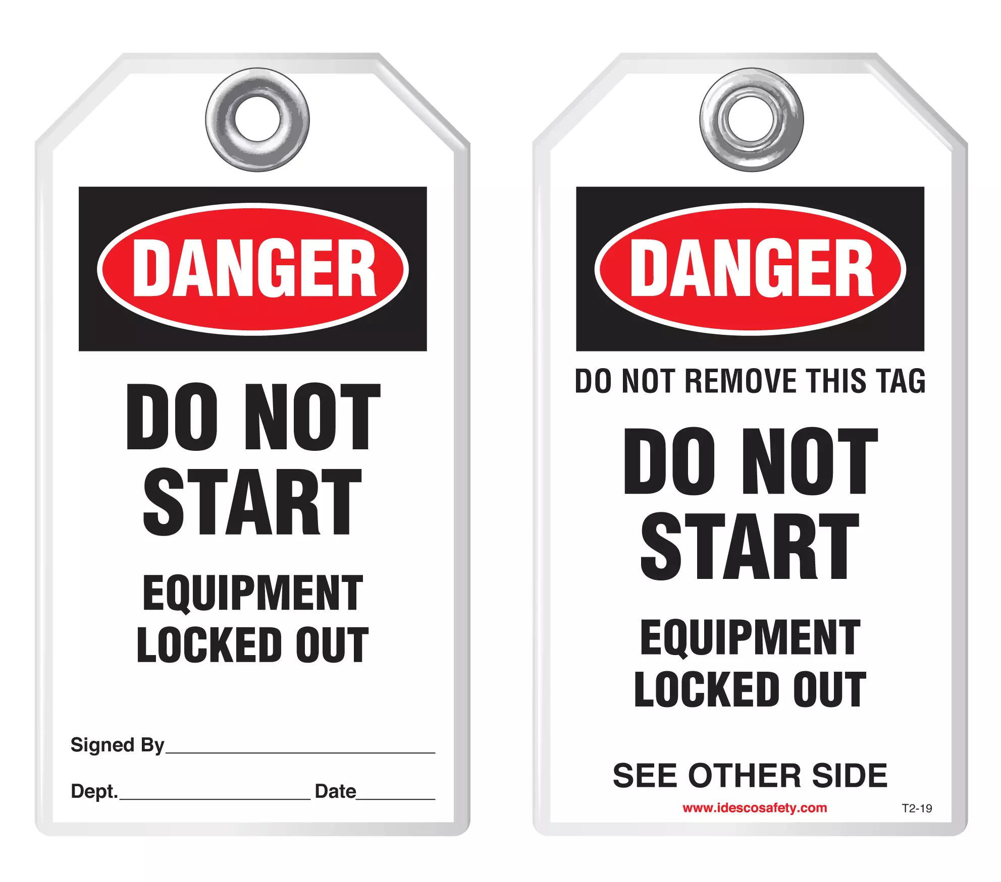 Idesco's Operational Safety Tags notify employees of operational hazards, specific dangers and warnings. These OSHA-compliant tags are durable and strong and withstand moisture, dirt, grease, chemicals and extreme temperatures. They are reinforced with a 3/8" metal grommet. Each tag has a pull strength that exceeds the OSHA-required 50 lbs. Printing is encapsulated inside rigid PVC. This rugged material has a durable, hard-matte finish which retains pen, pencil and marker notations and pencil may be erased for multiple use. The tags are clear and effective at reducing accidents and preventing worksite mishaps.