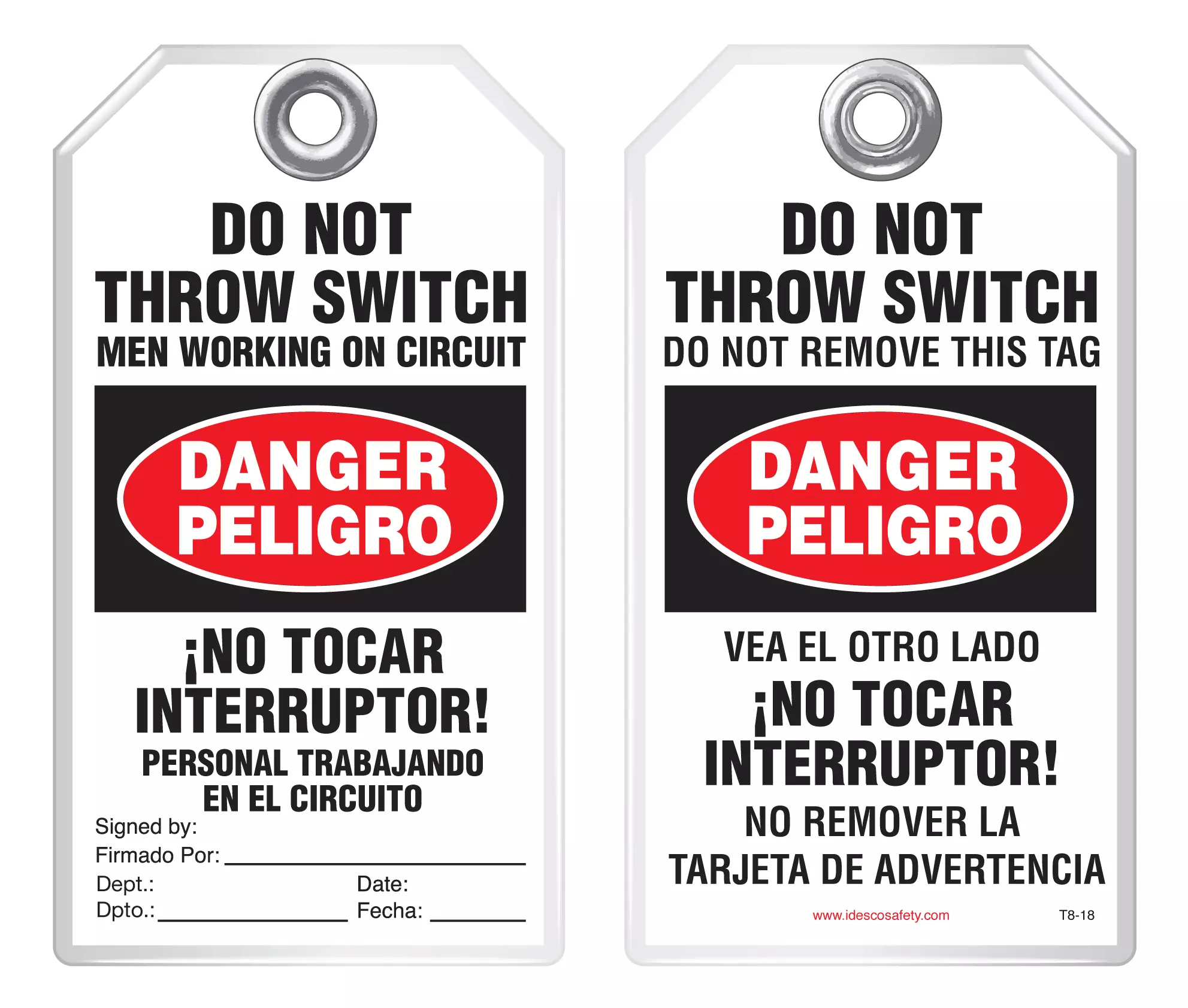 Bilingual Safety Tag - Danger, Peligro, Do Not Throw Switch, Men Working On Circuit, No Tocar Interruptor! (English/Spanish) T8-18