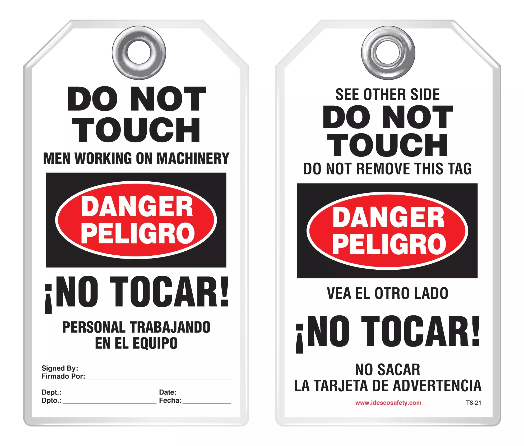 Bilingual Safety Tag - Danger, Peligro, Do Not Touch, Men Working On Machinery, No Tocar! Personal Trabajando En El Equipo (English/Spanish) T8-21