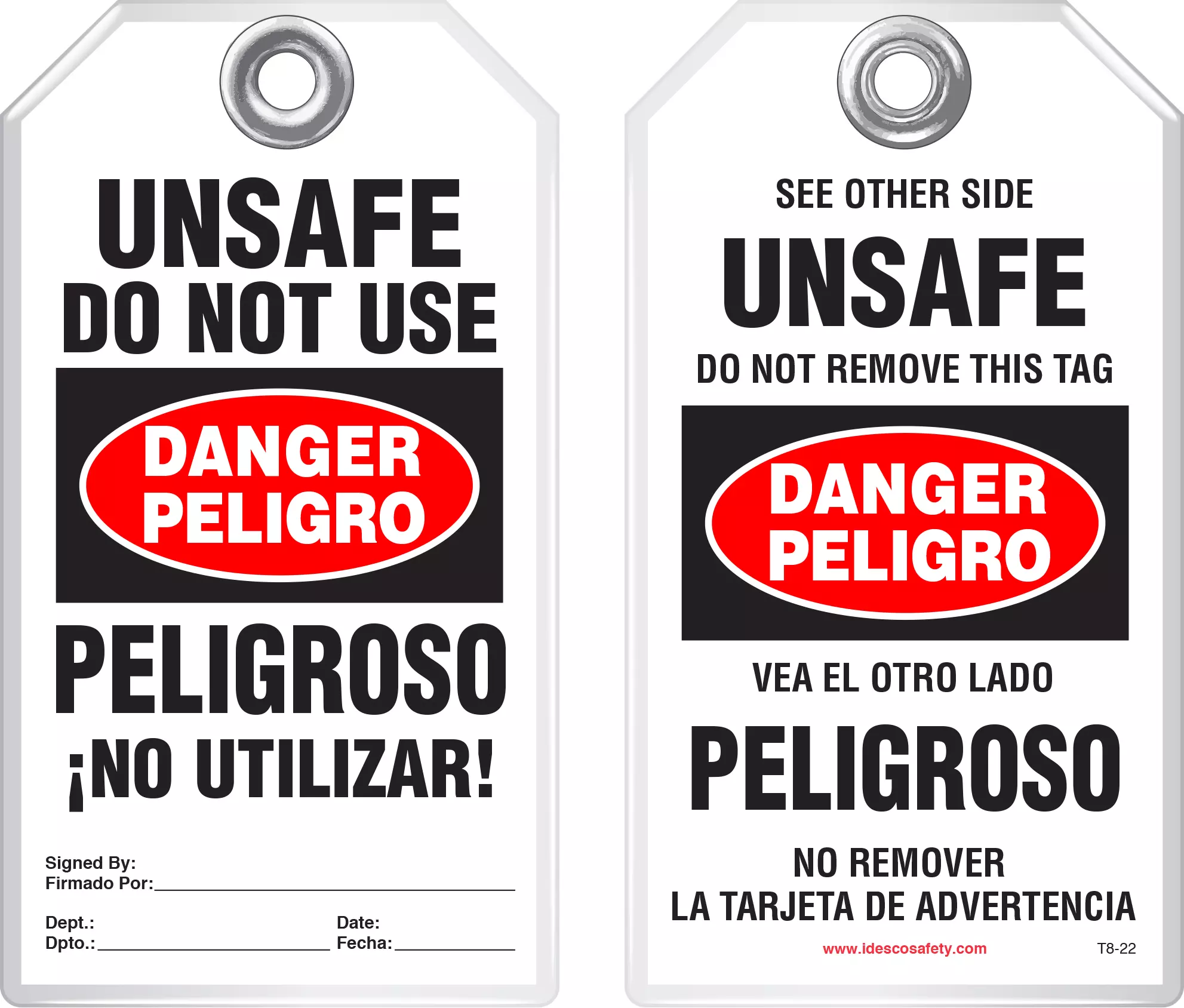 Bilingual Safety Tag - Danger, Peligro, Unsafe, Do Not Use, Peligroso, No Utilizar! (English/Spanish) T8-22