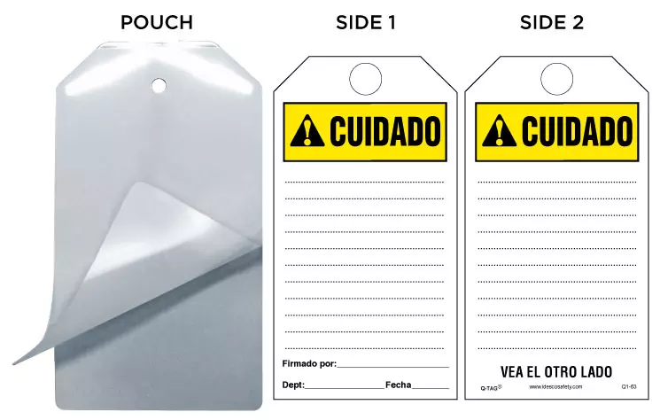 These Self-Laminating Tag Kits allow you to customize a tag by writing specific instructions in pen, pencil or marker. The tag is then laminated with a heavy-duty Laminating Pouch included in the Kit, by passing the tag and pouch through an Idesco desktop laminator (or other laminating machine). The tag is sealed in 20 mils of rigid plastic, fully protected from moisture, dirt, grease and chemicals. This durable tag exceeds the OSHA-required 50 lbs for lockout situations. Laminating Pouches are available with a matte finish on both sides, a gloss finish on both sides, or with one side matte, one side gloss.