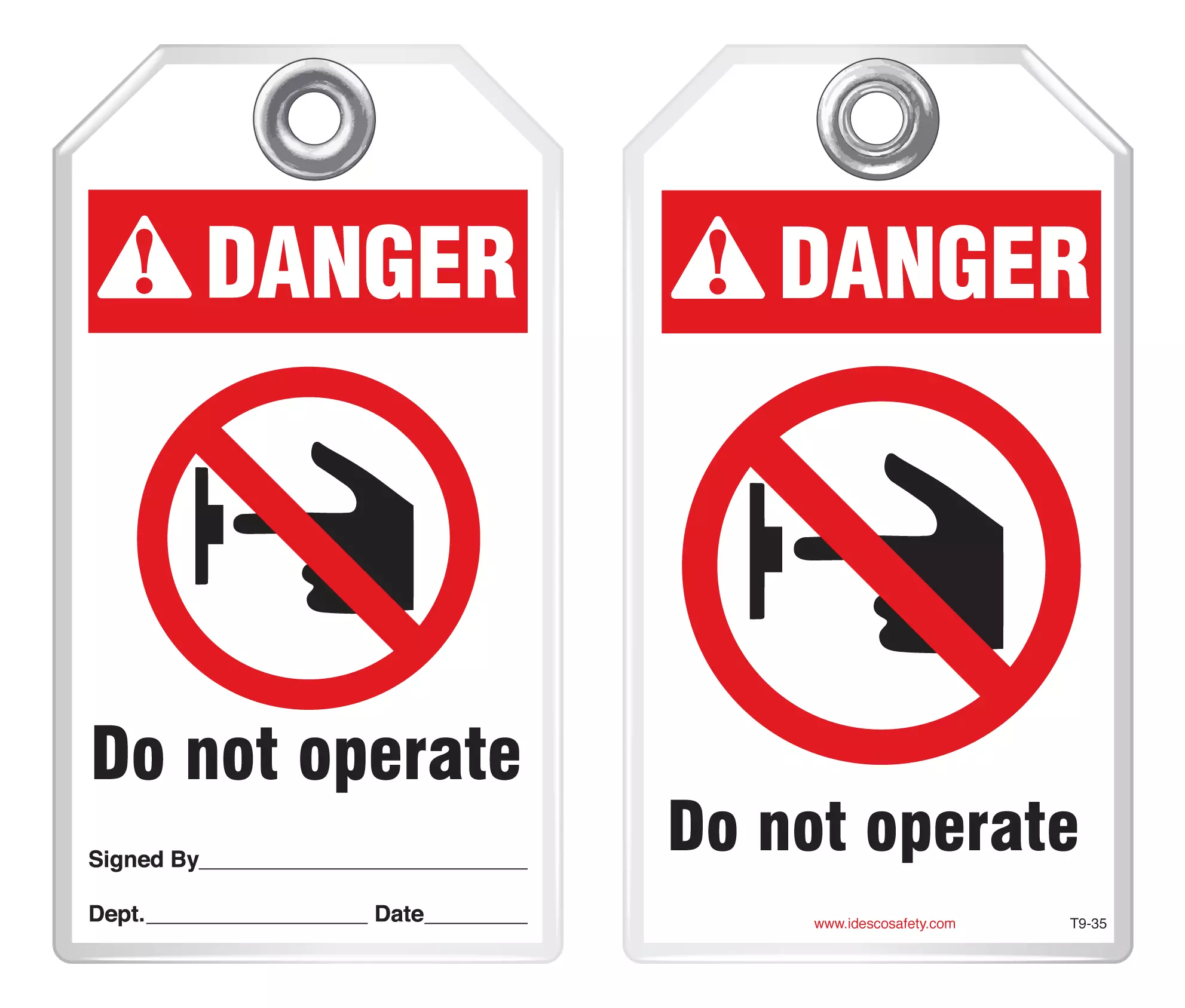 Idesco Safety's Classic Industrial safety tags are uniquely durable and strong and they are the most popular lockout safety tag for thousands of industrial companies around the world! They hold up against moisture, dirt, grease, chemicals and extreme temperatures. Each tag has a 3/8 hole reinforced with a metal grommet and has a pull strength that exceeds the 50 lb pull strength established by OSHA's Lockout/Tagout standard (OSHA 1910.147). Printing is UV protected and encapsulated inside rigid PVC. This rugged material has a durable, hard-matte finish which retains pen, pencil and marker notations and pencil may be erased for multiple use.