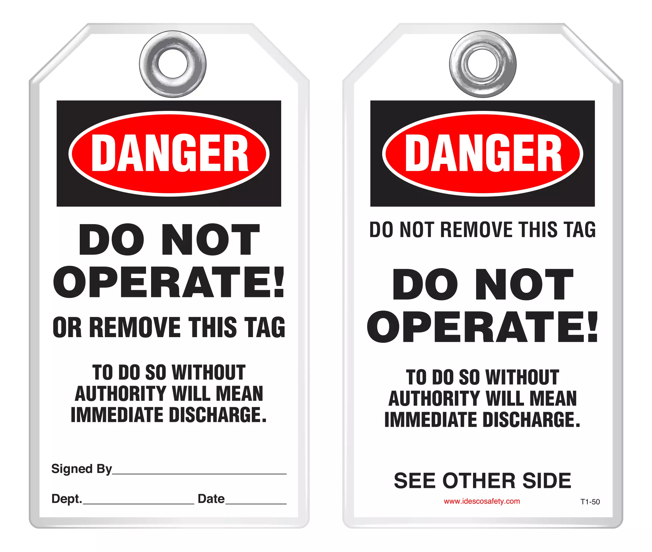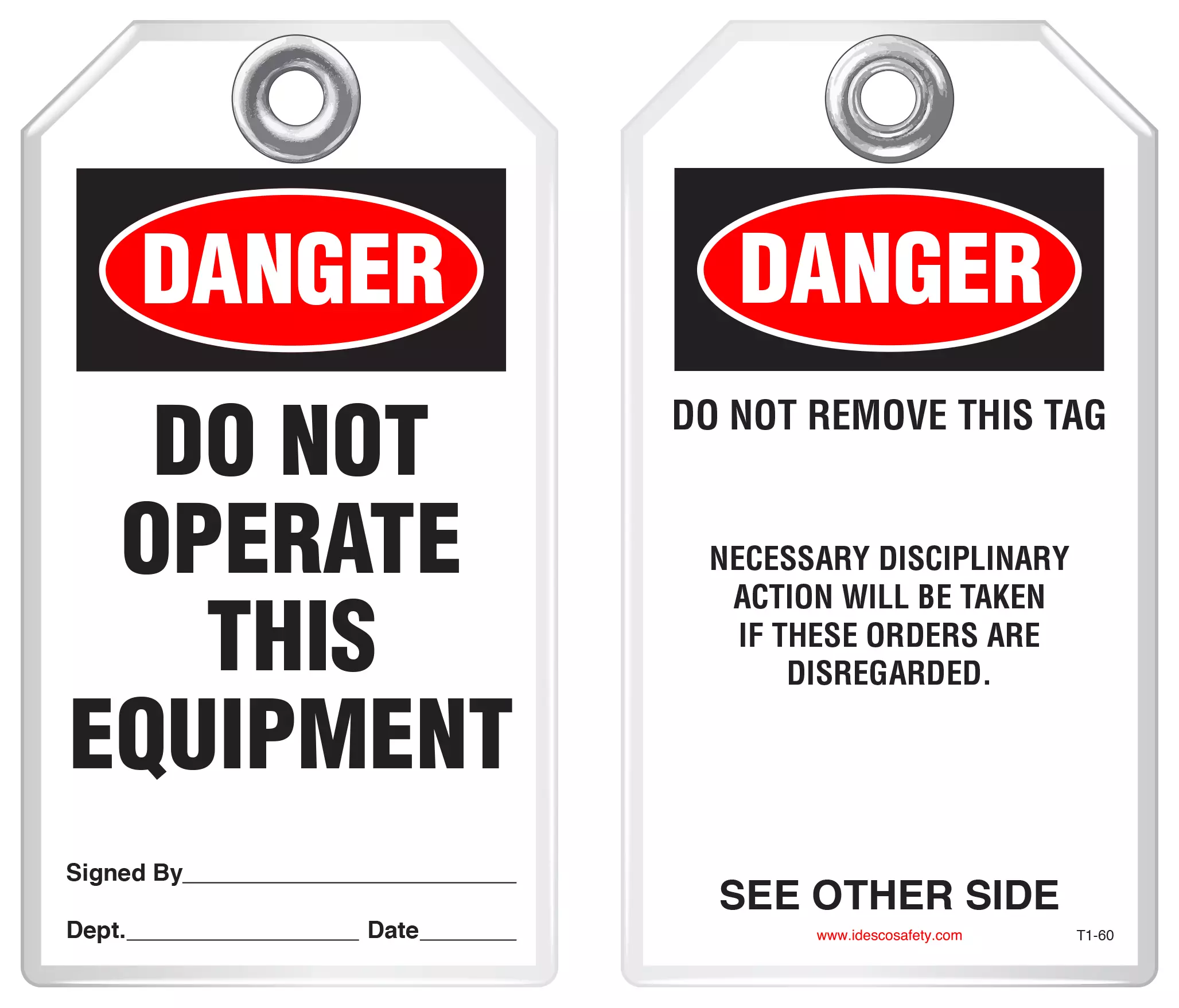 Idesco Safety's Classic Industrial safety tags are uniquely durable and strong and they are the most popular lockout safety tag for thousands of industrial companies around the world! They hold up against moisture, dirt, grease, chemicals and extreme temperatures. Each tag has a 3/8 hole reinforced with a metal grommet and has a pull strength that exceeds the 50 lb pull strength established by OSHA's Lockout/Tagout standard (OSHA 1910.147). Printing is UV protected and encapsulated inside rigid PVC. This rugged material has a durable, hard-matte finish which retains pen, pencil and marker notations and pencil may be erased for multiple use.